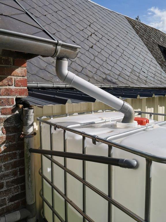 Installation d’une réserve d’eau de 1000 litres sur un support en parpaing.