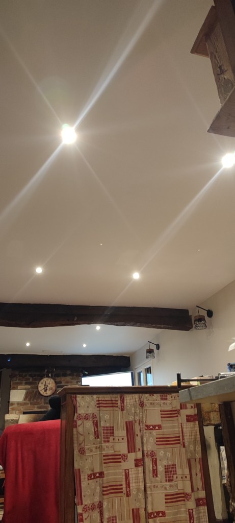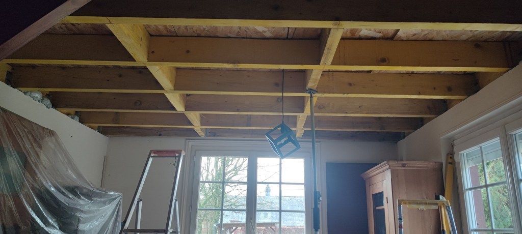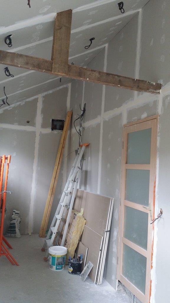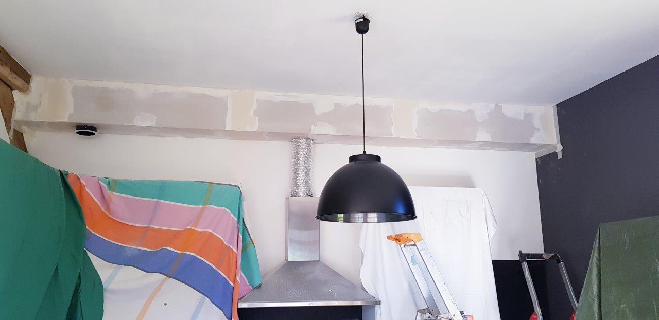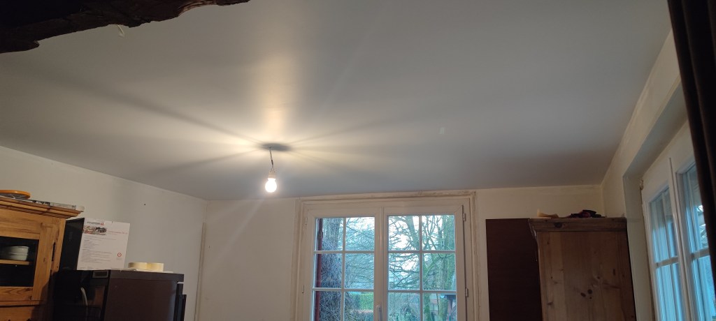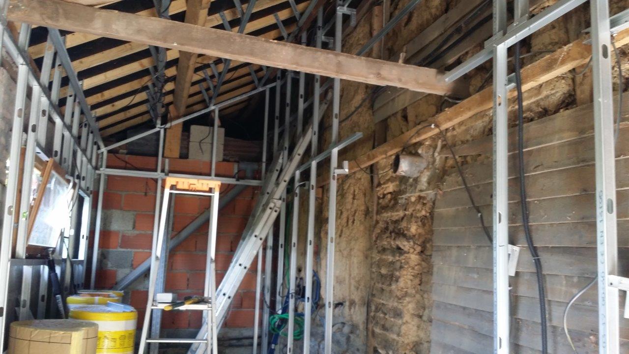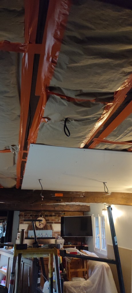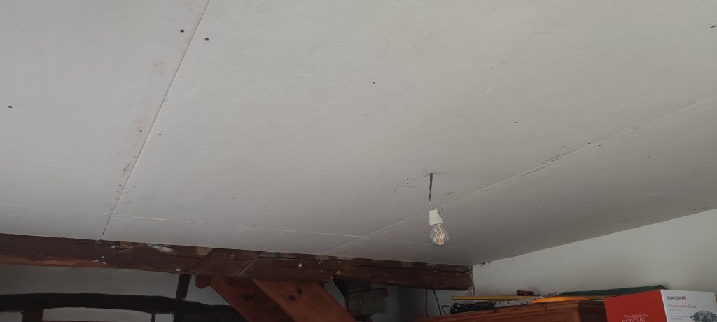 Pose de placoplâtre sur solives bois, passage de câbles pour branchement de spots, isolation en laine de verre, enduit et peinture.