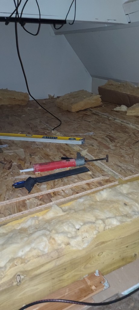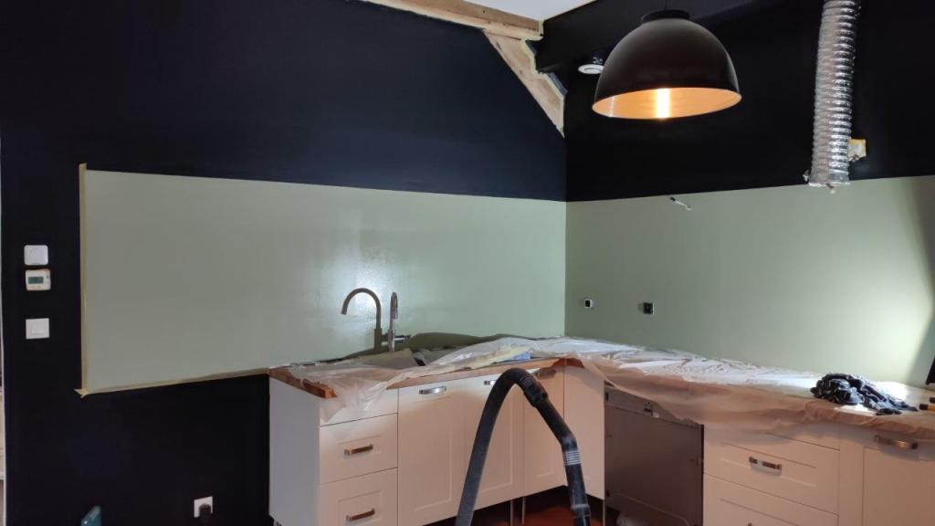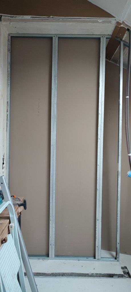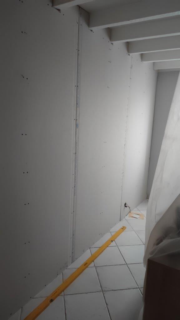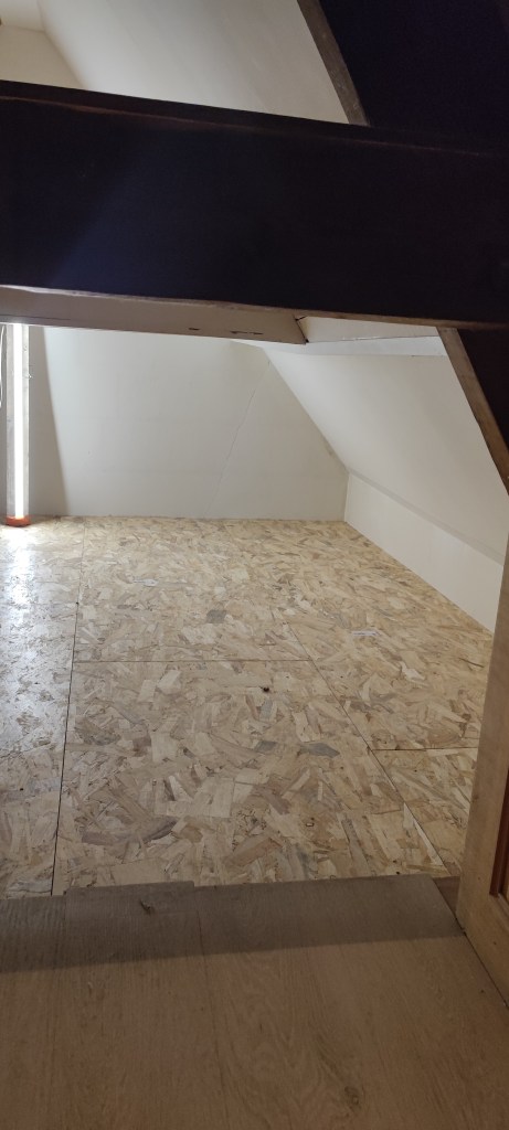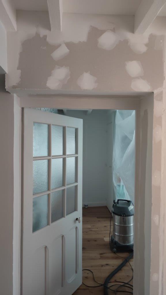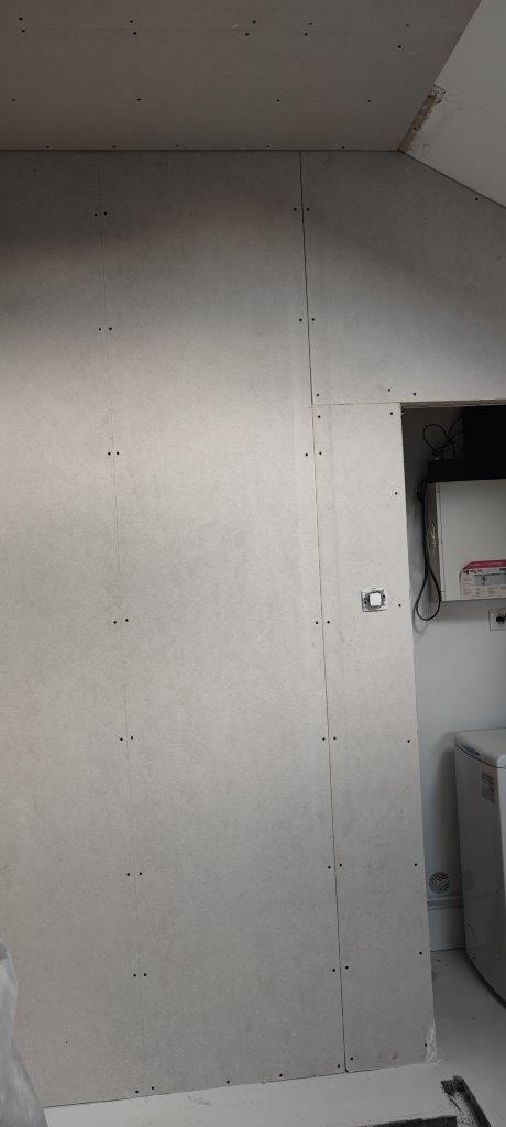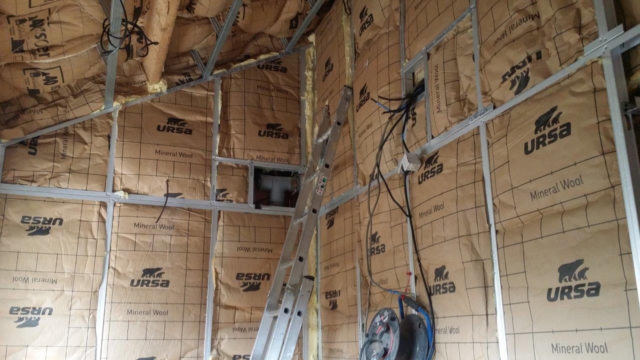 Pose de placoplâtre sur solives bois, passage de câbles pour branchement de spots, isolation en laine de verre, enduit et peinture.