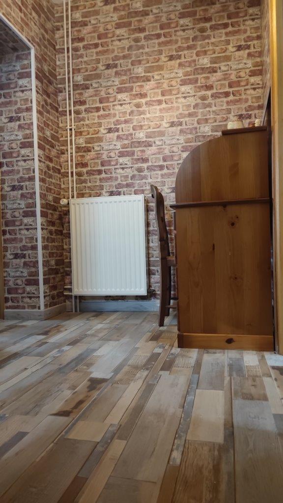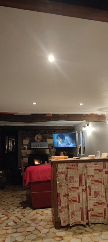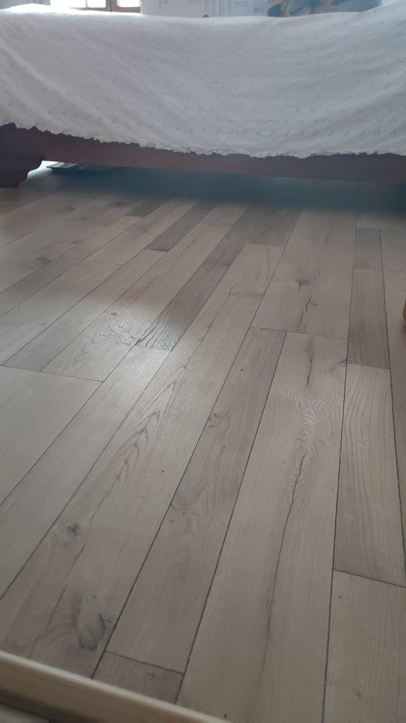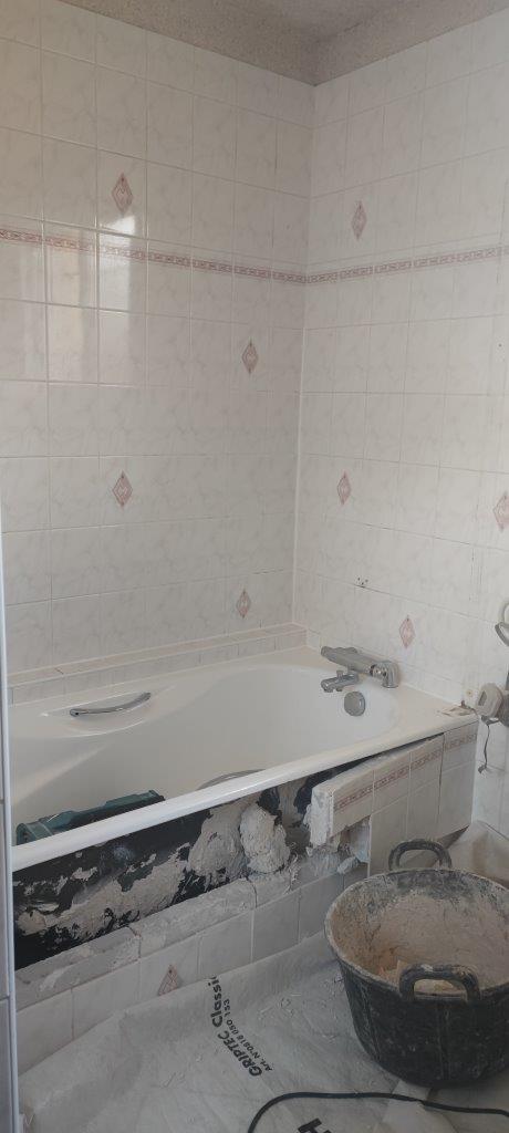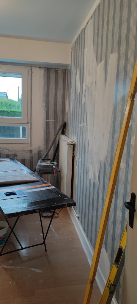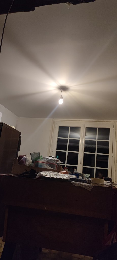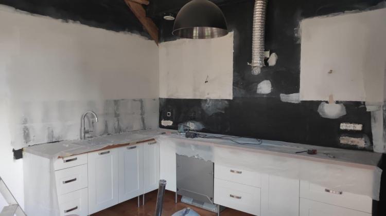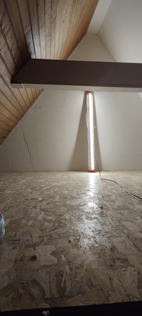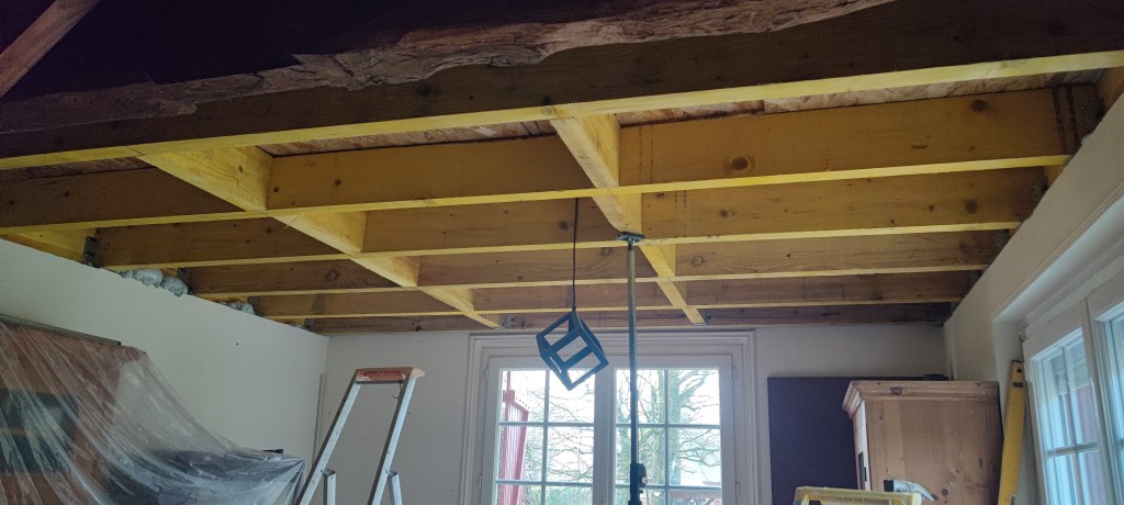 Pose de placoplâtre sur solives bois, passage de câbles pour branchement de spots, isolation en laine de verre, enduit et peinture.