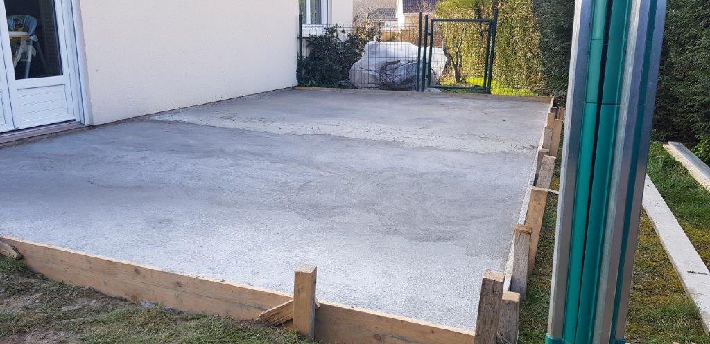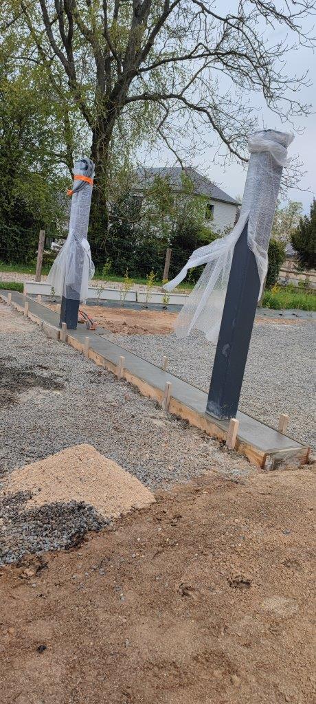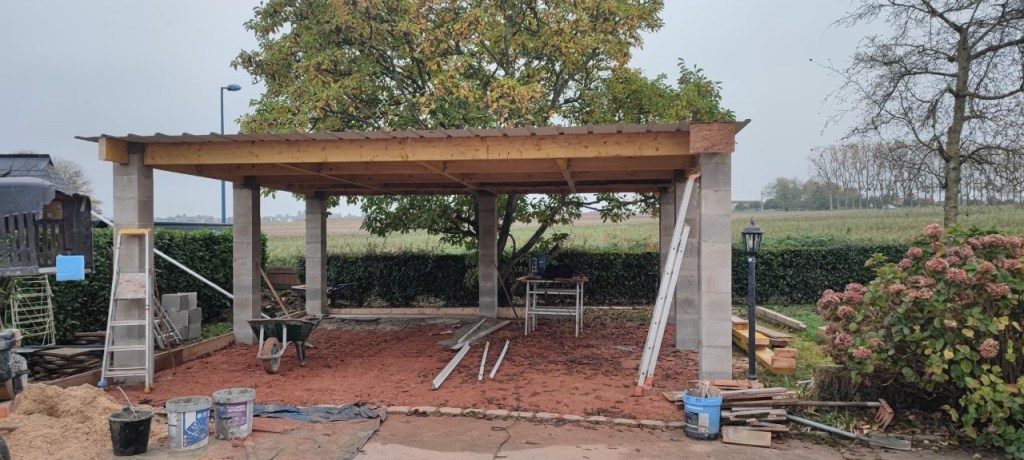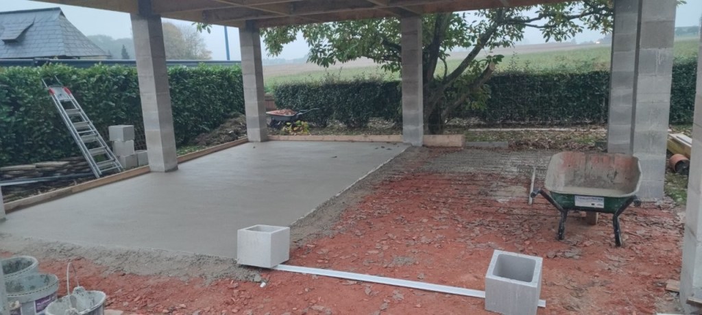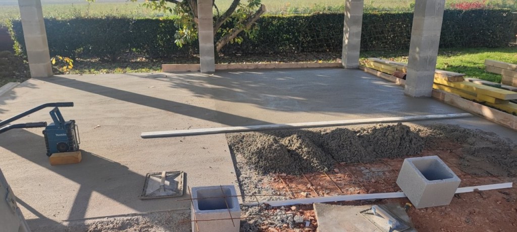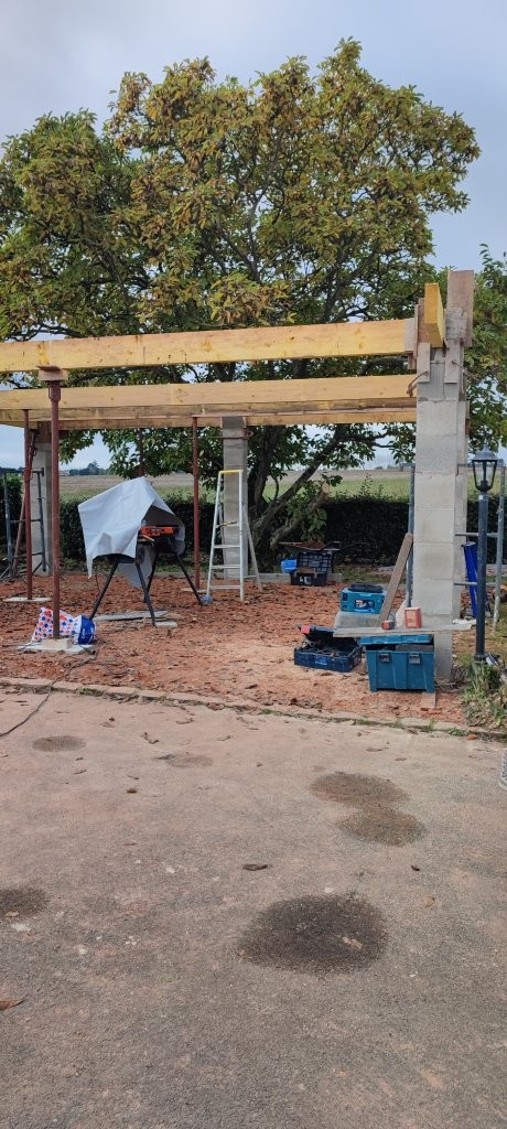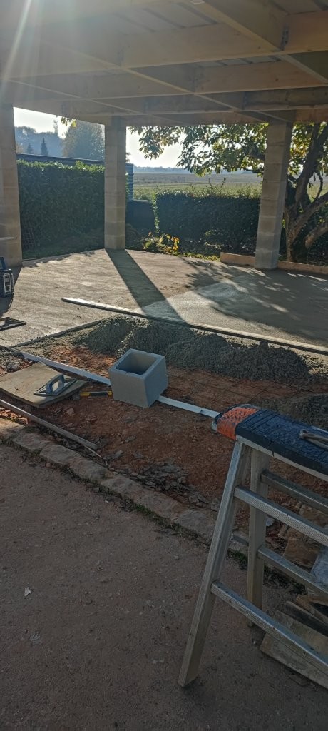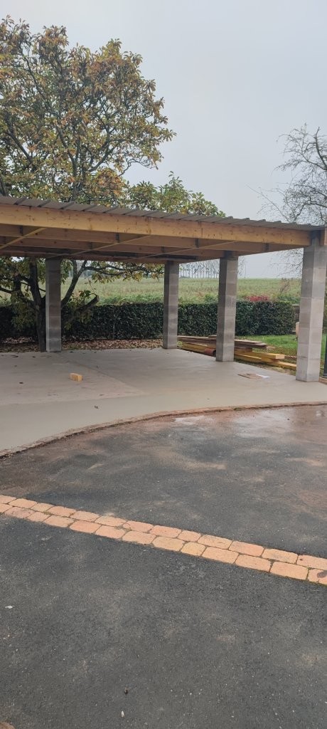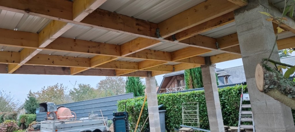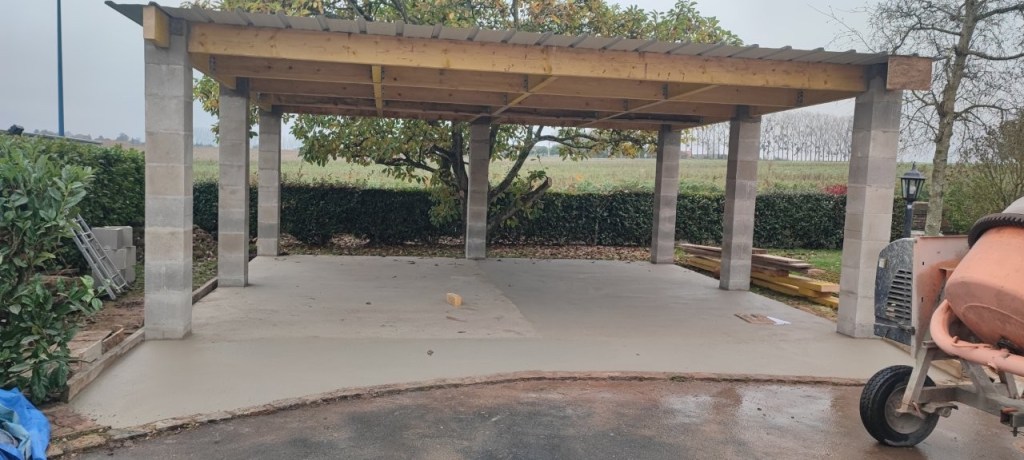 Réalisation d’un carport de 6m x5m. Poteaux armés et bétonnés. Madrillets 75×225, toiture bac acier et dallage de 10cm.