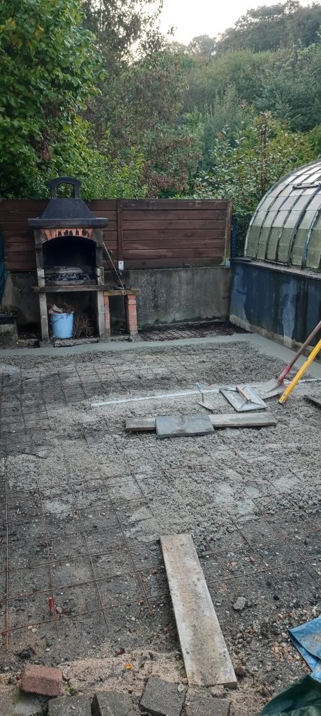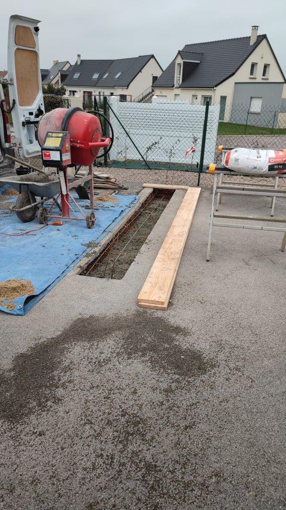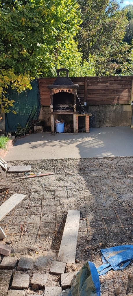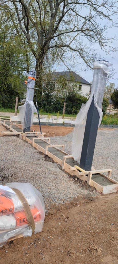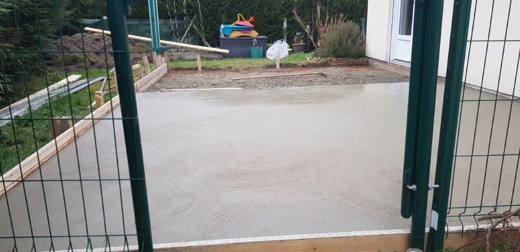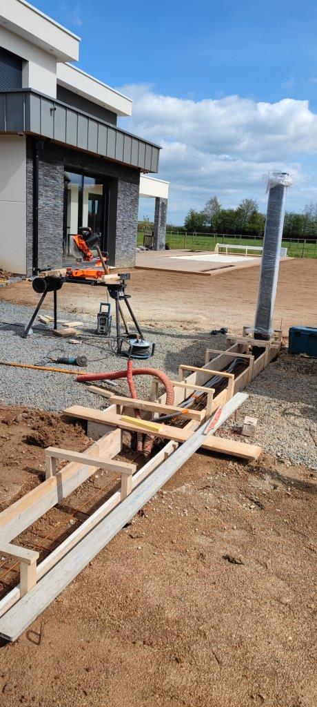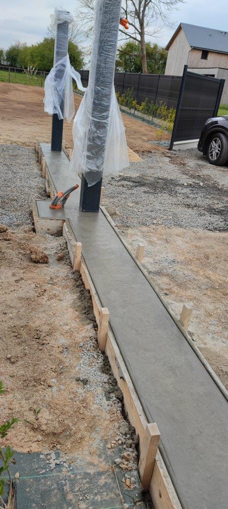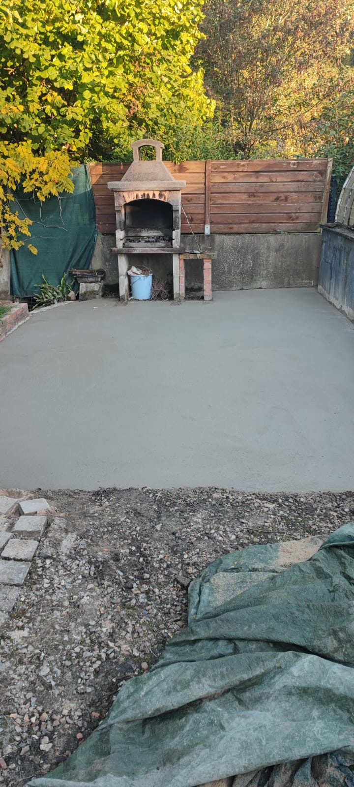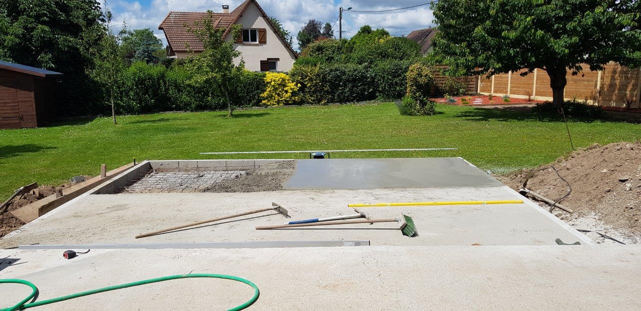 Réalisation d’un carport de 6m x5m. Poteaux armés et bétonnés. Madrillets 75×225, toiture bac acier et dallage de 10cm.