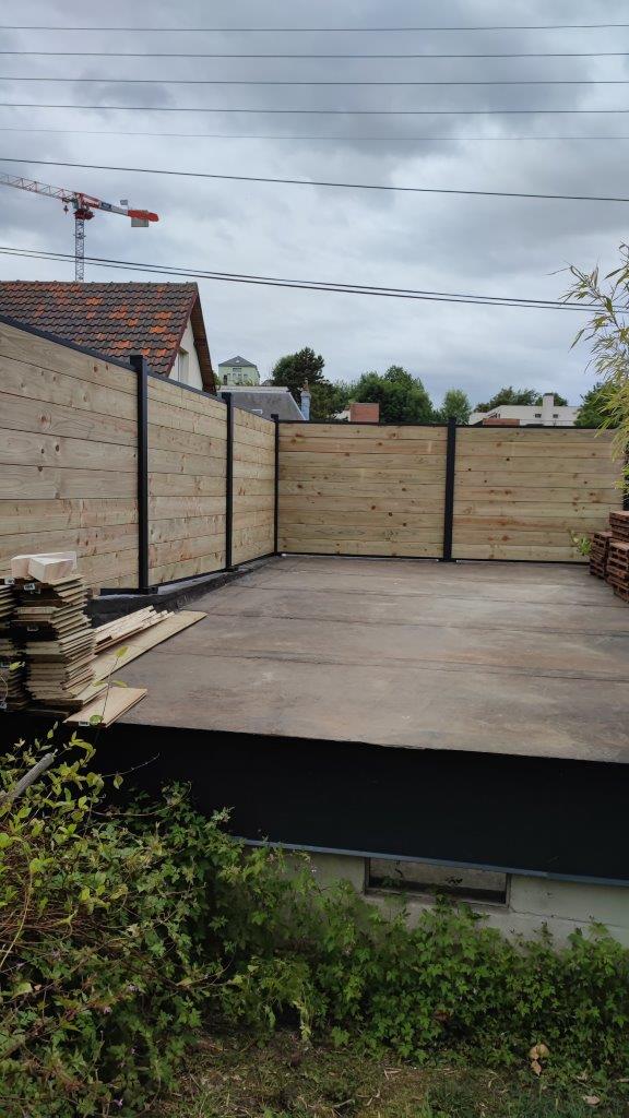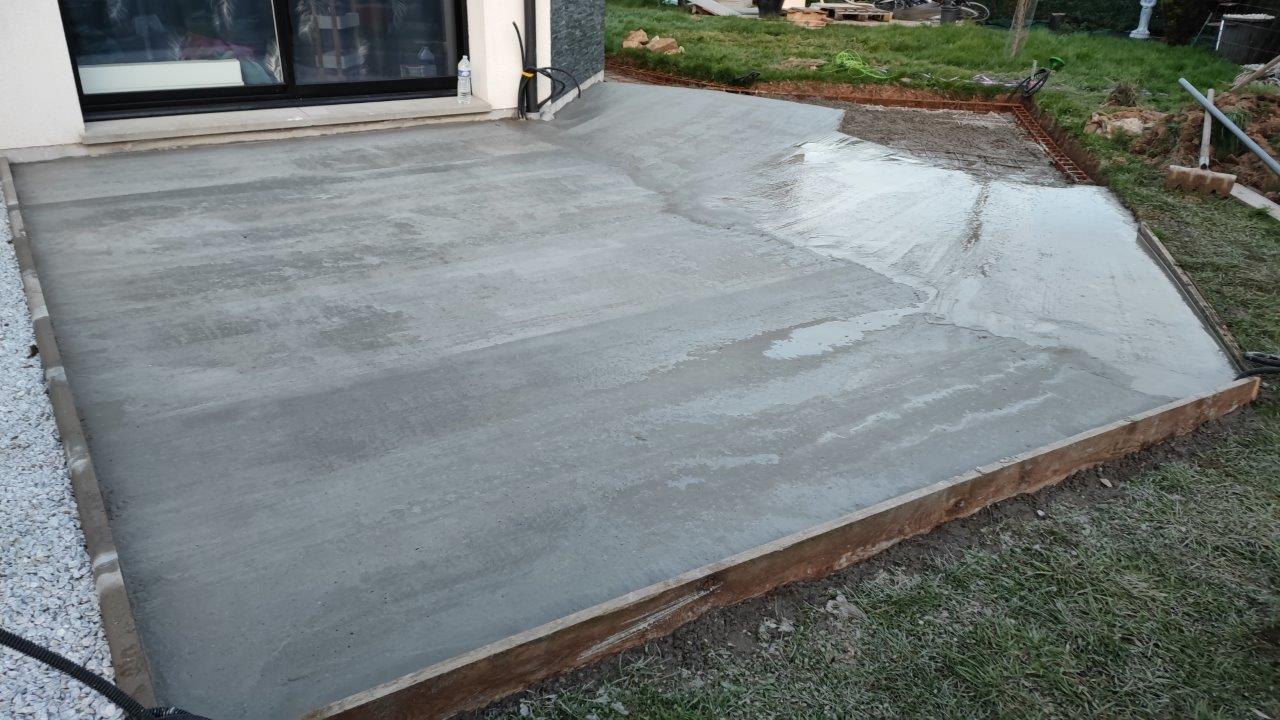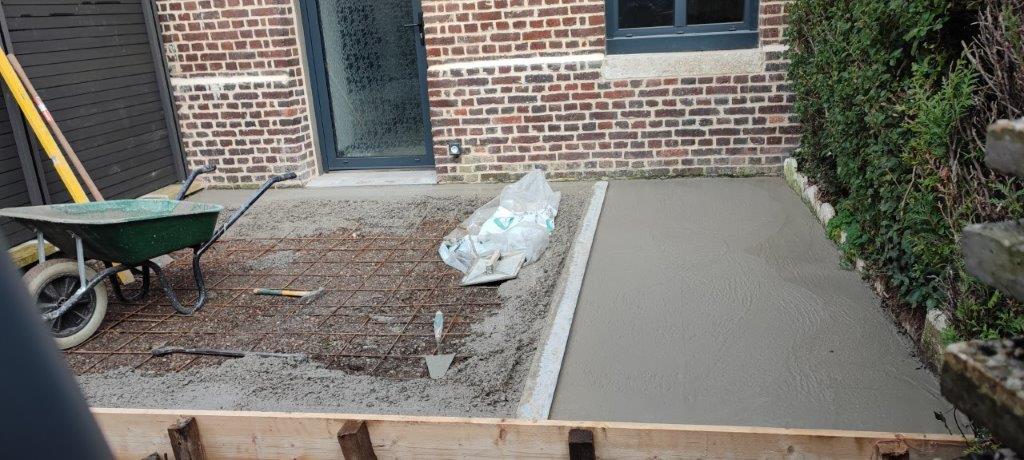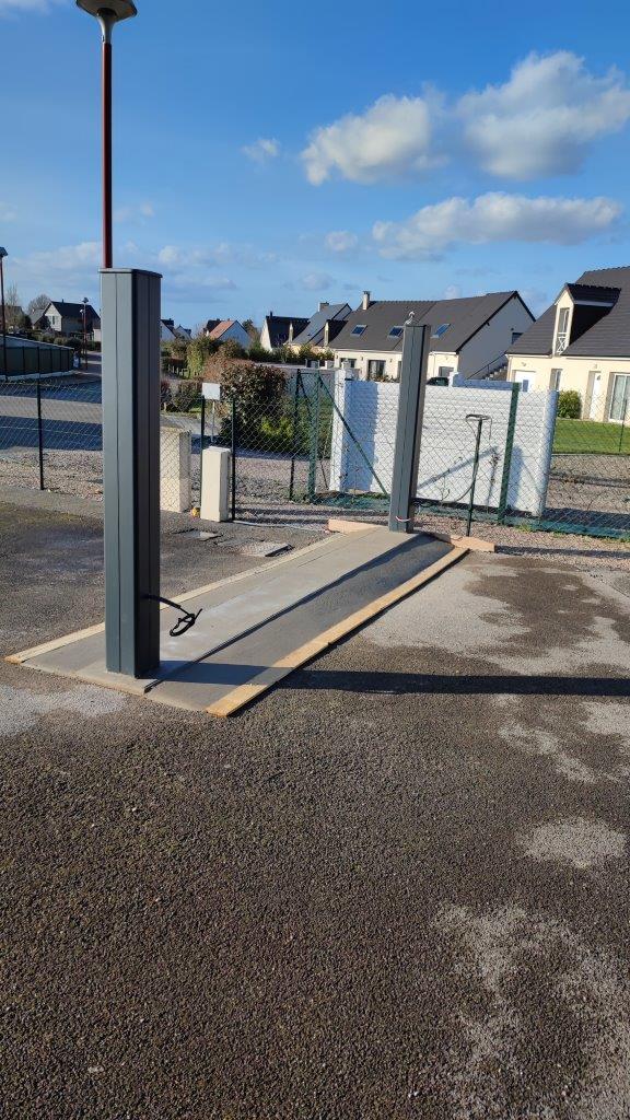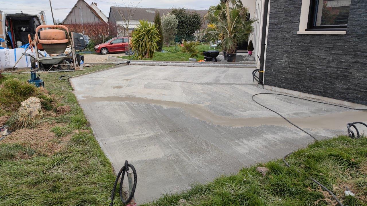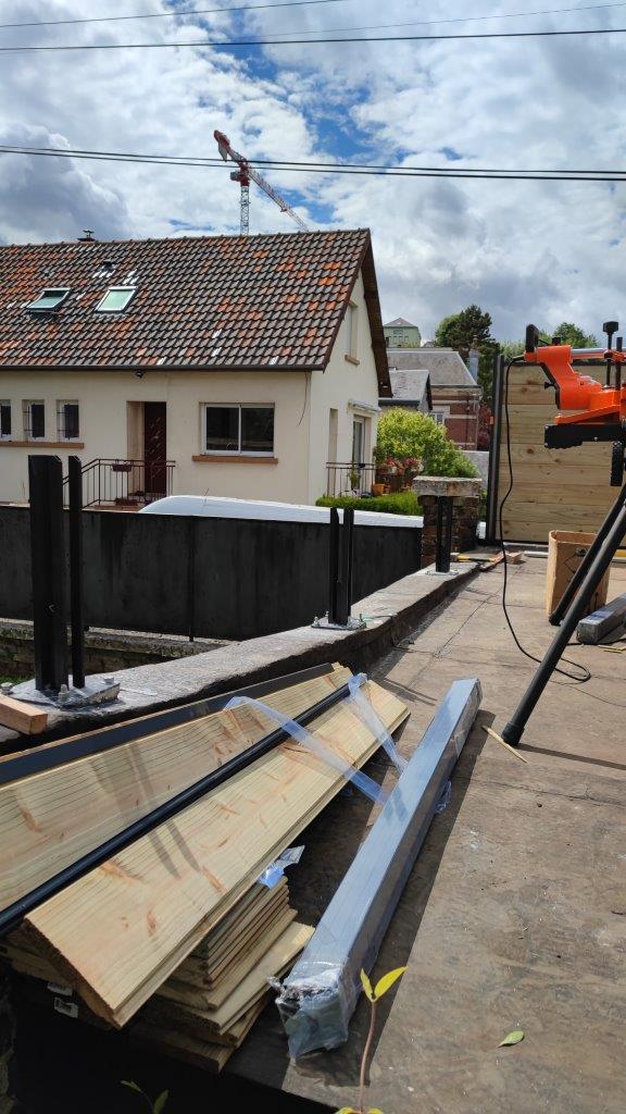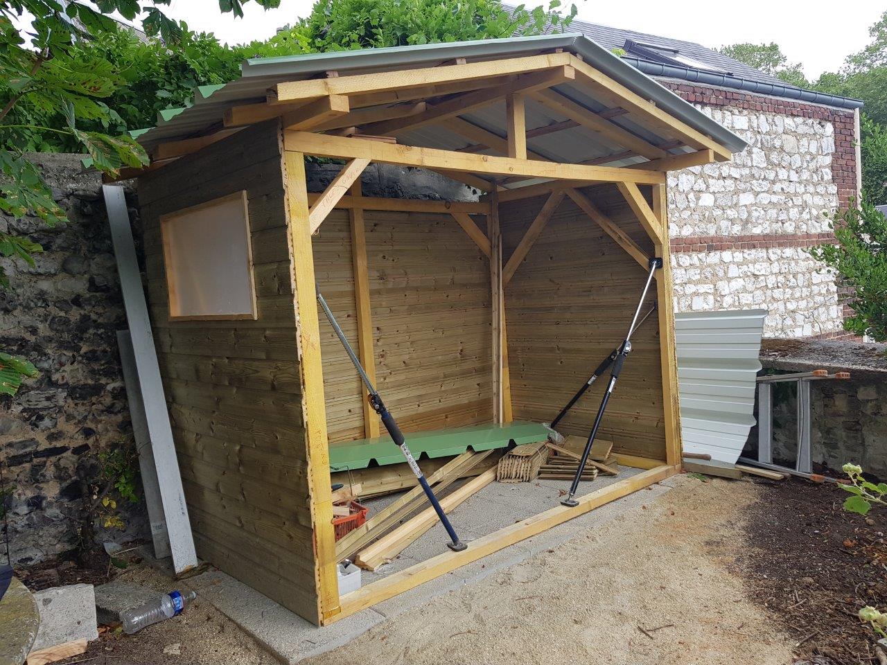 Réalisation d’un carport de 6m x5m. Poteaux armés et bétonnés. Madrillets 75×225, toiture bac acier et dallage de 10cm.