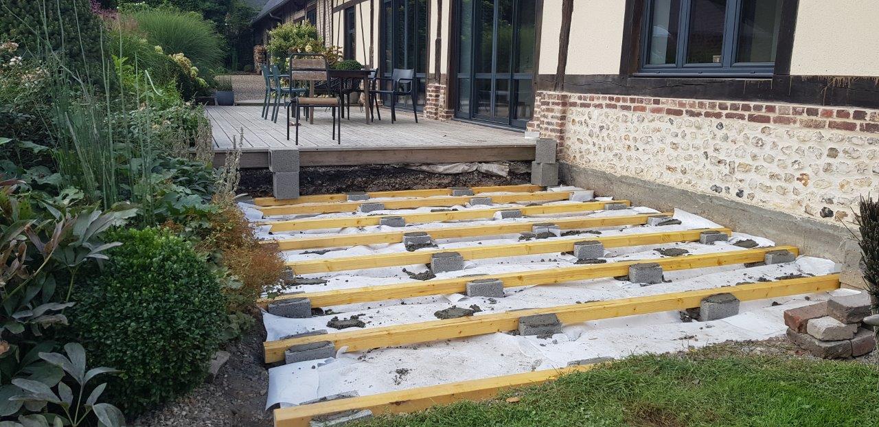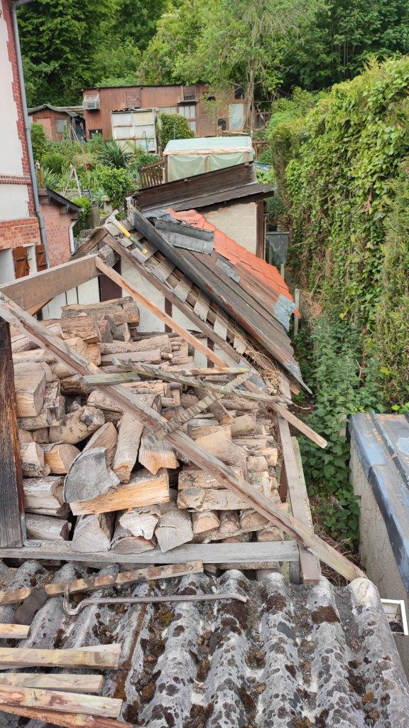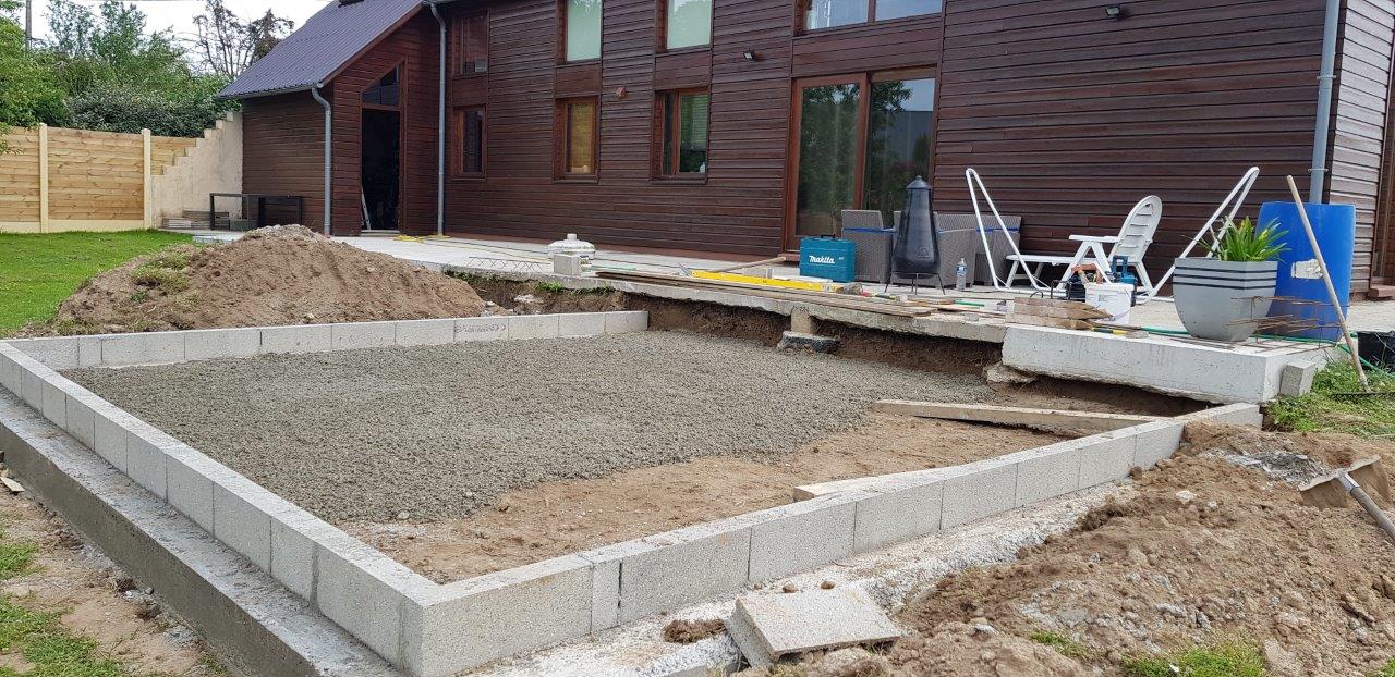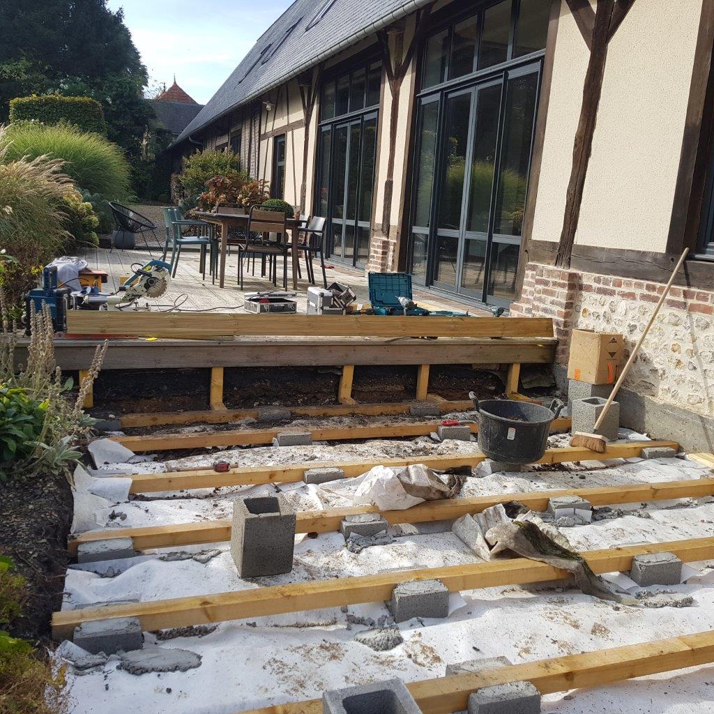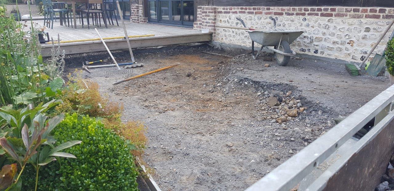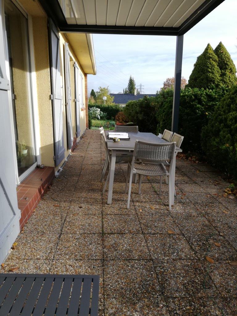 Réalisation d’un carport de 6m x5m. Poteaux armés et bétonnés. Madrillets 75×225, toiture bac acier et dallage de 10cm.